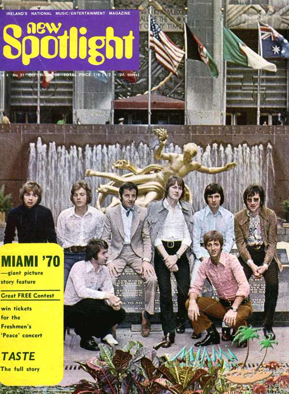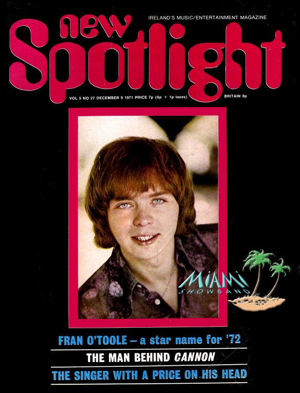 New Spotlight Weekly – October 1970By 1970, Pat McCarthy had left to join The Dreams and songwriter/vocalist/trombonist Danny Ellis had replaced him.From left: Fran O’Toole, Paul Ashford, Tony Bogan, Danny Ellis, Des Lee, Clem Quinn. Kneeling: Brian McCoy, Dickie Rock.