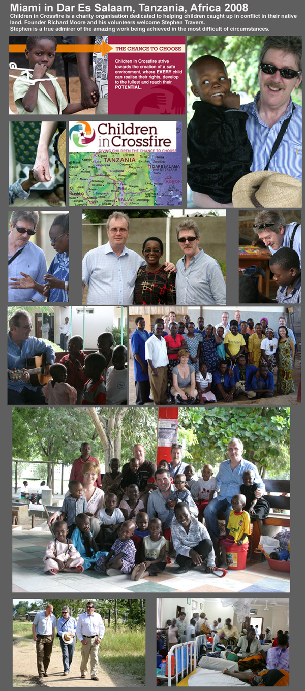 In May 2008, Stephen accepted an offer from the charity to witness, in person, the work of the organisation in East Africa. He says his visit to Tanzania as the representative of the band was “a life changing experience” and consequently, The Miami Showband is now fully committed to highlighting the wonderful work of “Children in Crossfire”. Paddy Dunning, the owner of Temple Lane Recording Studios in Dublin, generously put his excellent facility at the disposal of the project where The Miami Showband, with the children of Hazelwood Integrated College cross community School recently recorded the very appropriate Hoyt Axton song “Joy to the World” in aid of the charity. “The Miami Showband/Children in Crossfire” collaboration was managed by the acclaimed musician and fellow traveller to Tanzania, Morris Crum, whose untiring work on behalf of the charity is both inspirational and unrelenting.