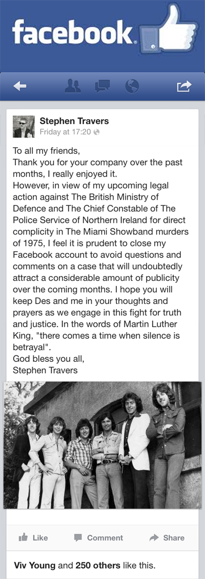 23rd July 2013 – Stephen Travers and Des McAlea have issued writs against the Ministry Of Defence and the Police Service Of Northern Ireland in connection with The Miami Showband Massacre.